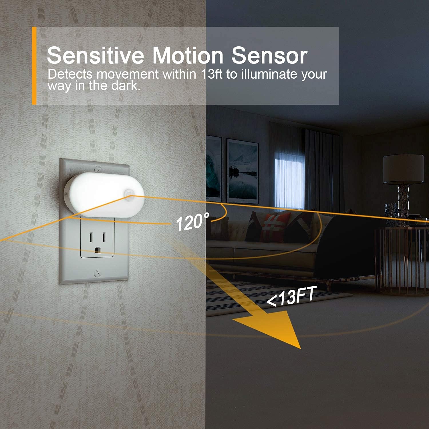 - Compact Size and Sensitive Motion Sensor: The size of the bright night light is 3 x 1.6 x 0.8 in and it can be plugged in any standard outlet while leaving the second outlet free to use. The motion sensor will be activated to provide you with a detection angle of 120 degrees and a distance range of 10-13ft