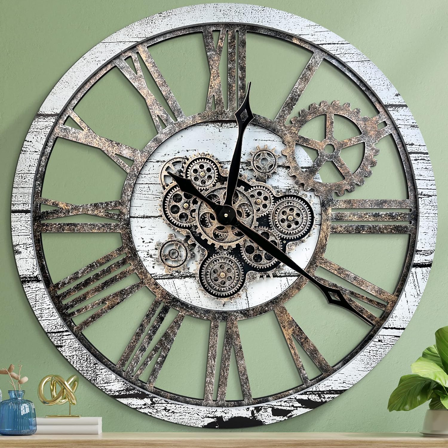 HOIBAI Large Wall Clock Clocks for Living Room Decor Oversized 30 Inch Wall Decor Farmhouse Vintage Rustic Industrial Roman Big Chic Home Decor Wall Clock for House Bedroom, Moving Gears Clock