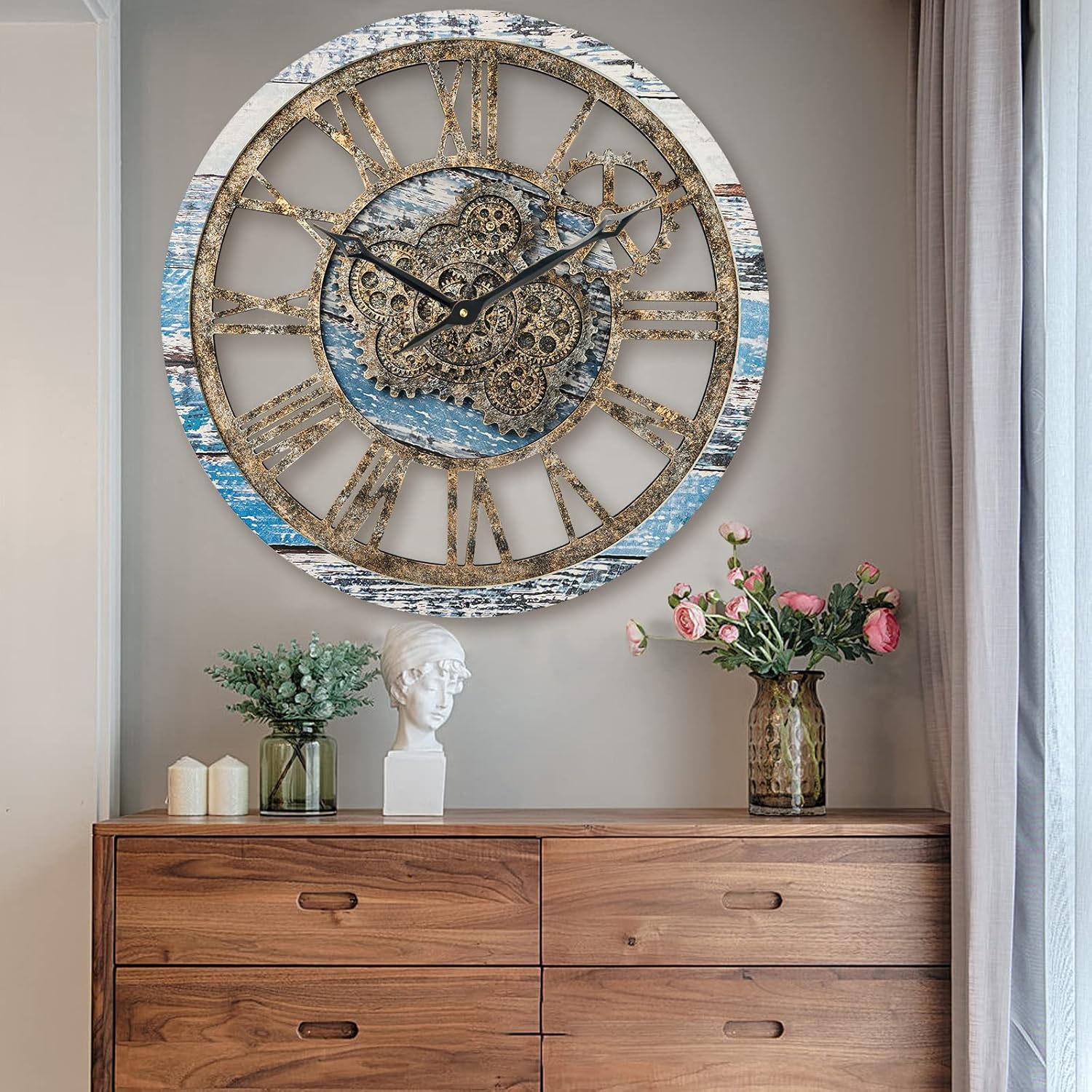 HOIBAI Large Wall Clock, Wall Clocks for Living Room Decor 20 Inch Farmhouse Vintage Rustic Kitchen Wall Decor Vintage Roman Oversized Wall Clock for Home Bedroom House Office, Moving Gears Clock