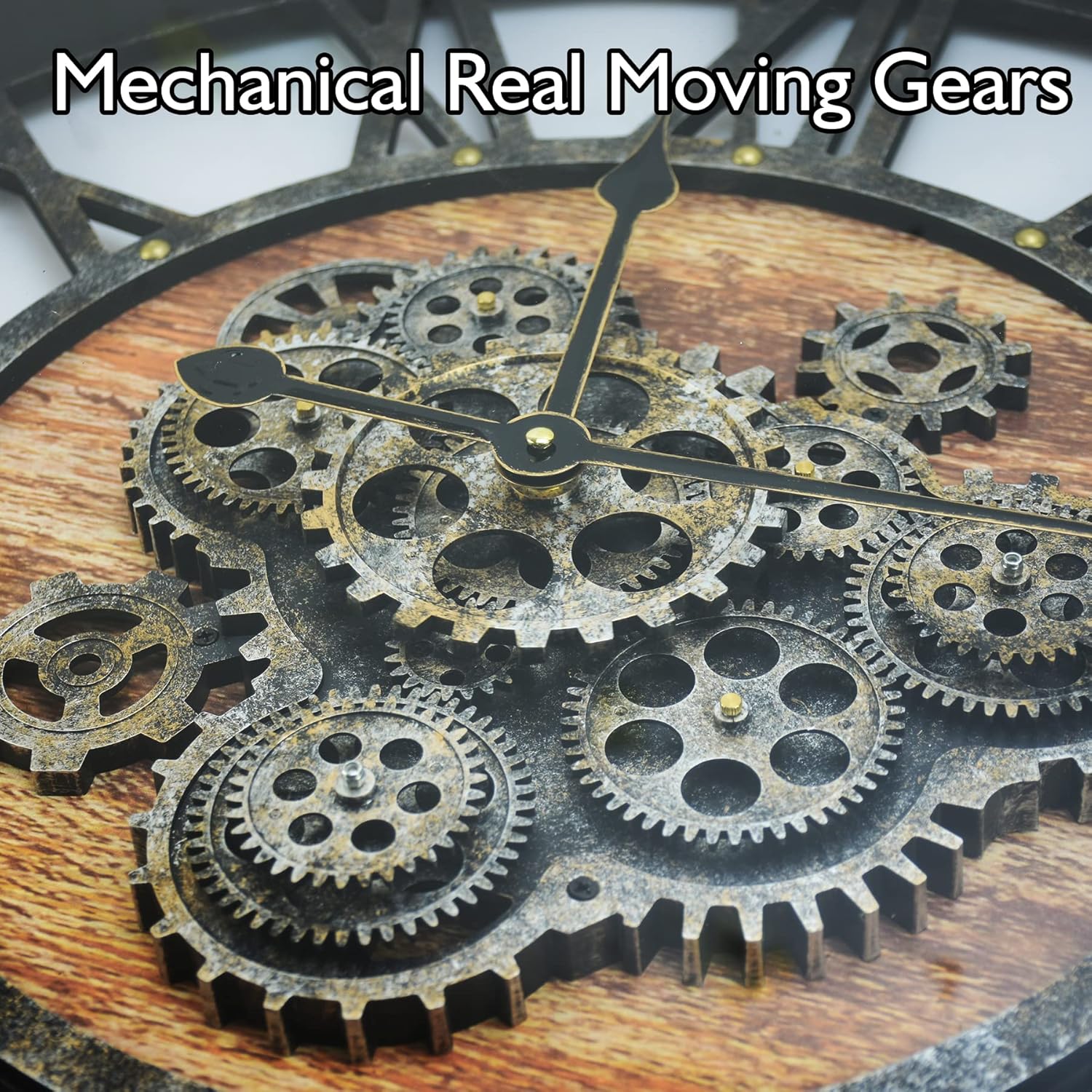 - Unique Design, Only For Your Home: Round solid Wood frame and classic retro skeleton with real mechanical moving gears in the central, the wooden frame is handcraft, showing unique attractive wood grain color and small natural knots; artificial rust-imitated treatment marks on the skeleton for vintage and industrial effect; stronger tempered glass resists any breakage and keeps safety whenever; The design is very different from other clocks, just to break the ordinary, only for your home