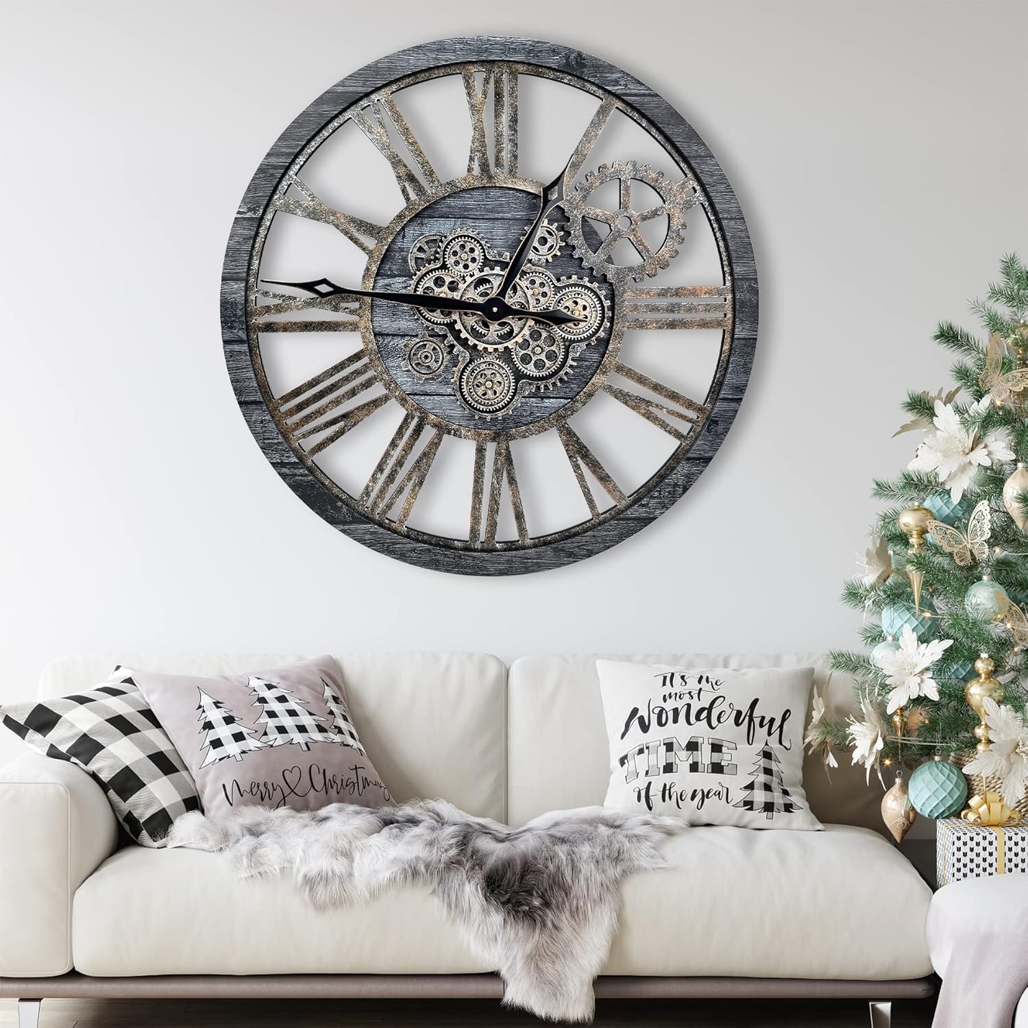 - WIDE APPLICATIONS: Oversized wall clock is not only a timepiece, but also a piece of artwork, greatly adding charm to a room, like living room, farmhouse, fireplace, bedroom or dining room, studio, gallery, loft, cafe, bar, club, etc. Decorative wall clock will become an instant conversational piece for the moving gears and how cool it looks. Also awesome gifts for families or friends.