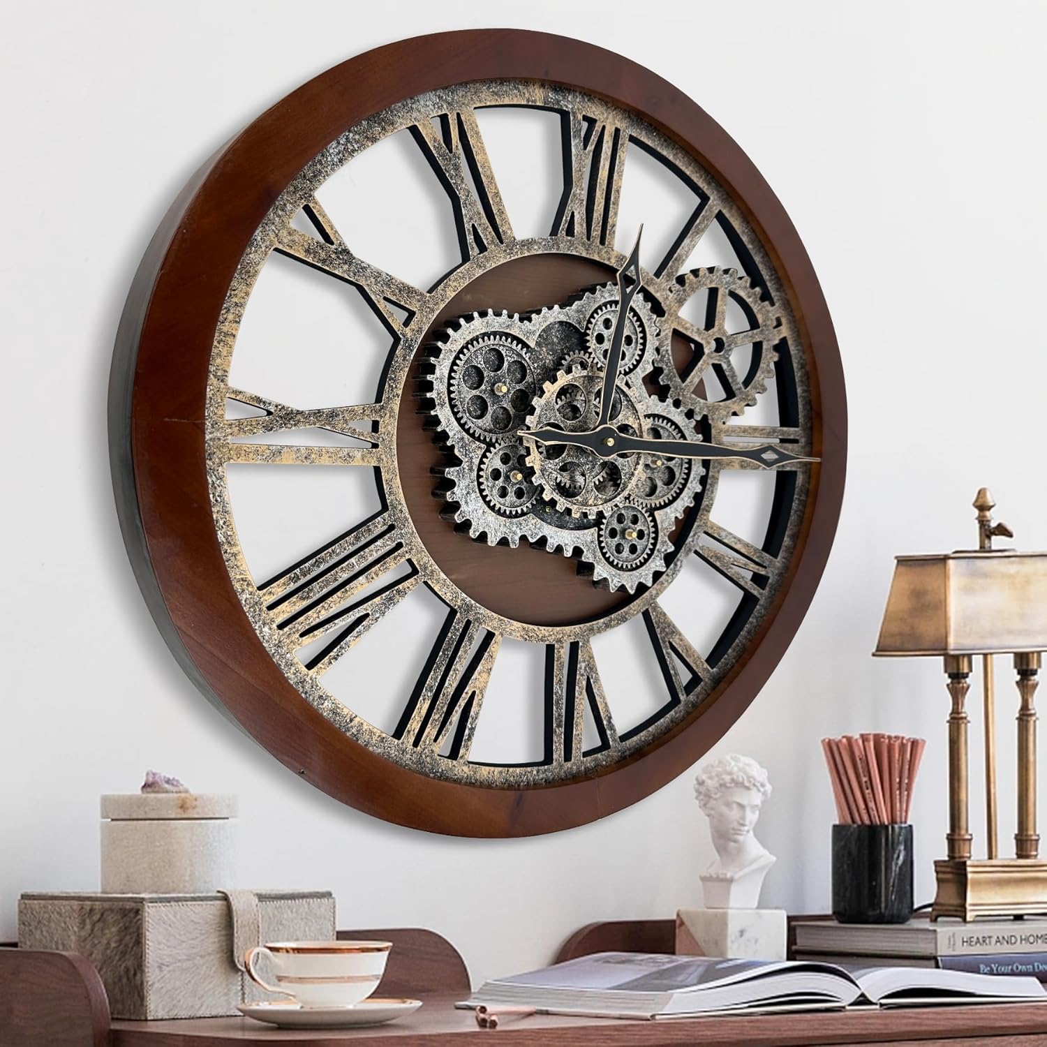 HOIBAI Large Wall Clock, 24 Inch Wall Clocks for Living Room Decor Farmhouse Vintage Rustic Kitchen Wall Decor Vintage Roman Big Oversized Wall Clock for Home Bedroom House Office, Moving Gears Clock