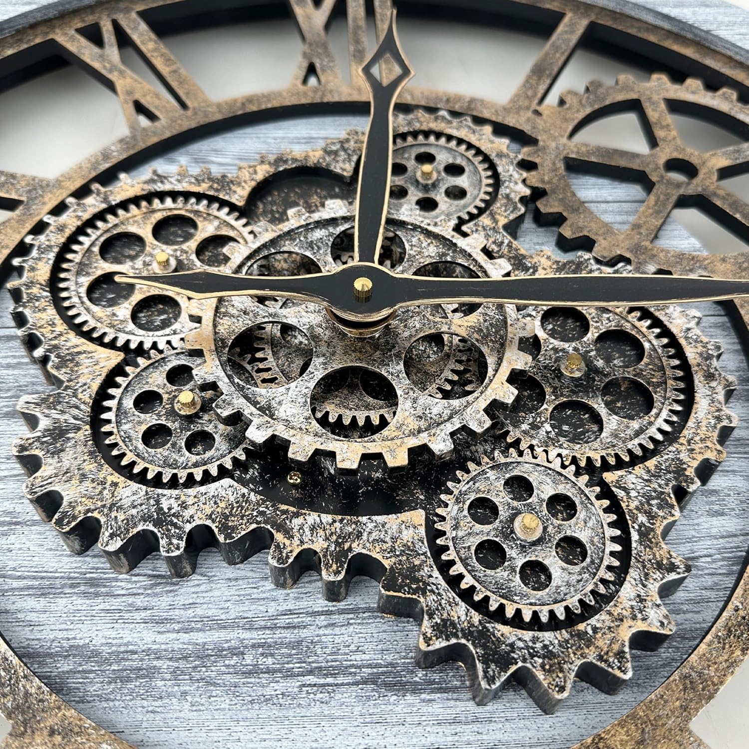 - 【Real Moving Gear Clock】All gears for the wall clock are real moving! Design with rustic bronze-color and industrial style. An creative combination of four gears for a retro look, has a very exquisite decorative effect makes the wall clock become a chic art works. The large wall clock crafted of nature wood & MDF. Big roman numeral numbers and wood rustic moving gears perfect for any room decor.