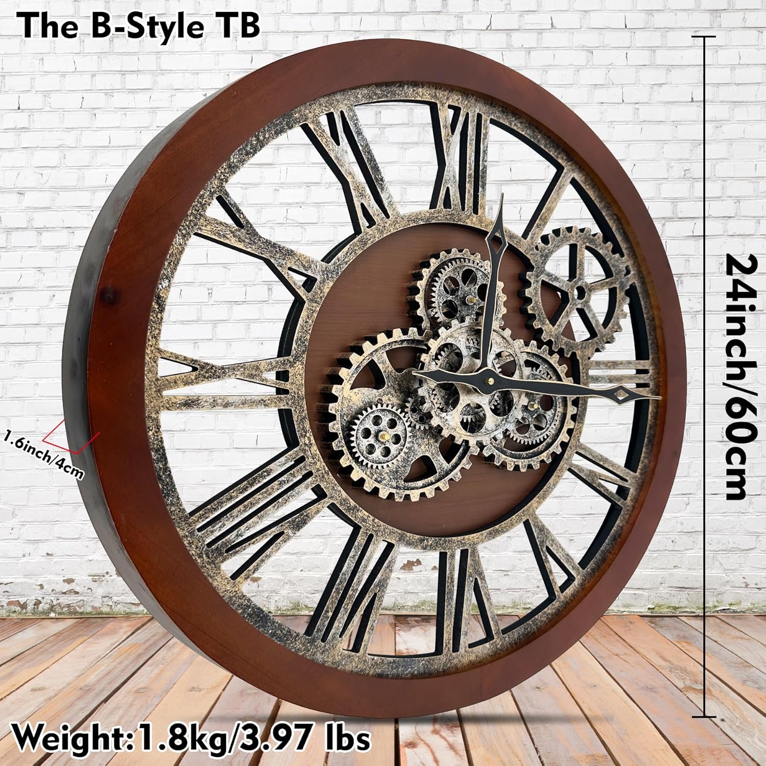 The B-Style Large Wall Clock 24 inch Moving Gear Wall Clock Oversized Vintage Farmhouse Wall Clocks for Living Room Decor Rustic Industrial Wood Clock (Black walunt Wood and Bronze)
