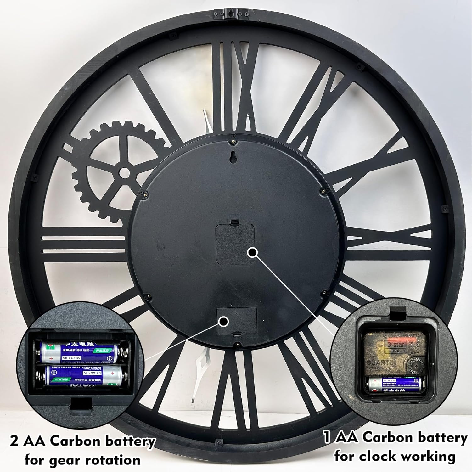 - ACCURATE TIME AND BATTERY OPERATED: Quality quartz sweeping mechanism for accurate time without any ticking sounds. Power by 3 AA Carbon battery operated (not included), large industrial clock takes 2 sets of batteries, one set for the clock and the other for gears that spin. Both of them can be used individually