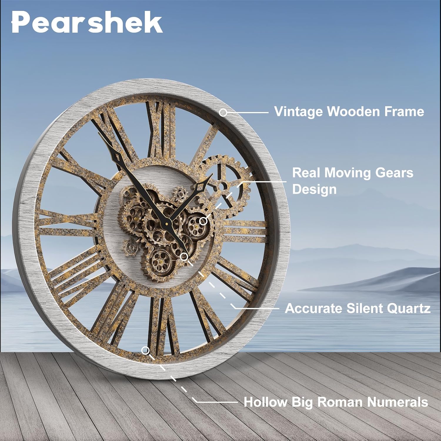 - REAL MOVING GEARS: Large wall clock with unique moving parts is as attractive as it is functional. Put batteries in, various gears start rotating fluently. Moving gear wall clock is amazing looking on the wall and will get so many compliments on it. Made from solid wood and painted by Rust-like color on wall clock create a very rustic and industrial atmosphere. Farmhouse wall clock is professionally handmade and pursuit of naturalness, so it may have some little imperfections