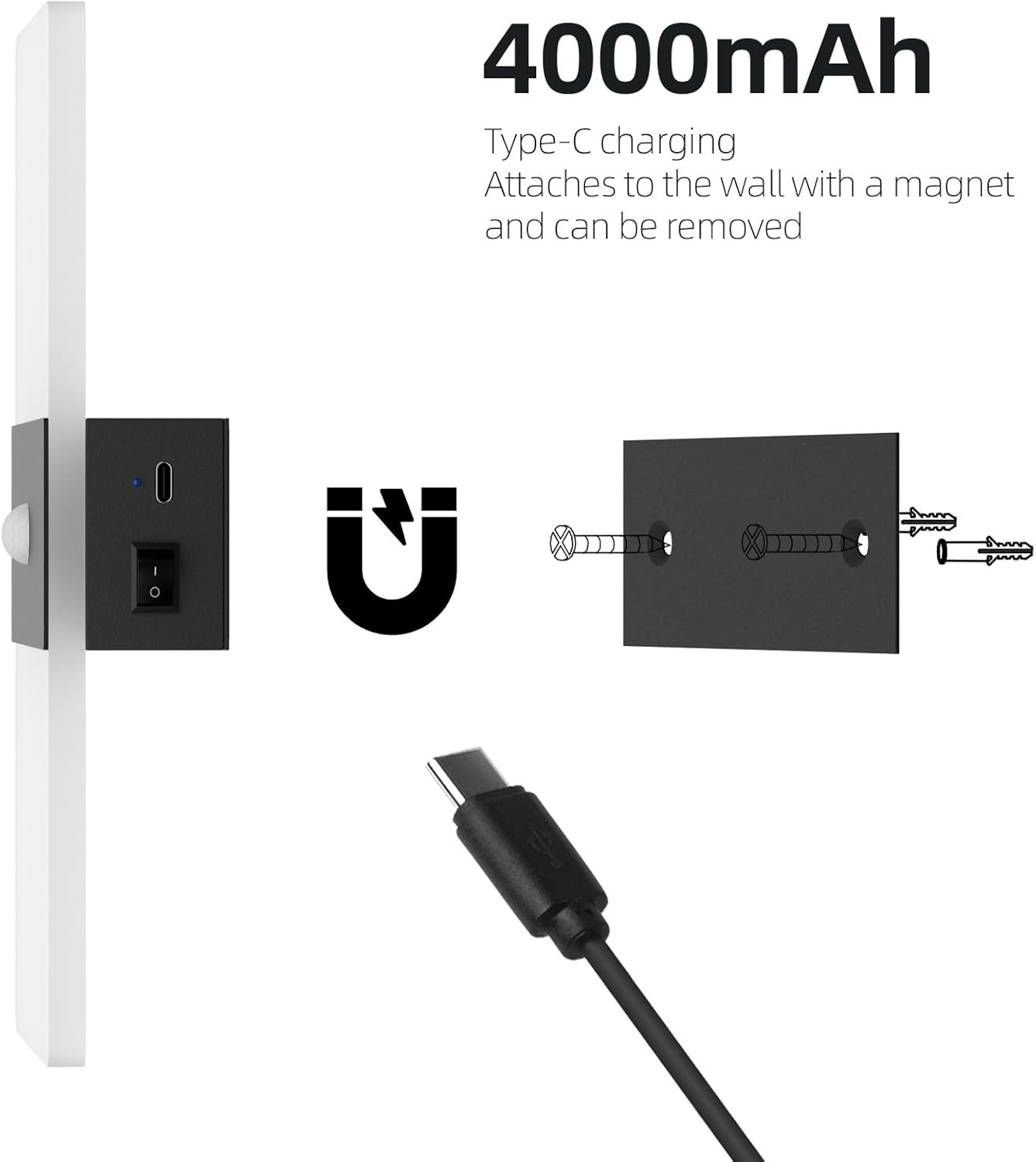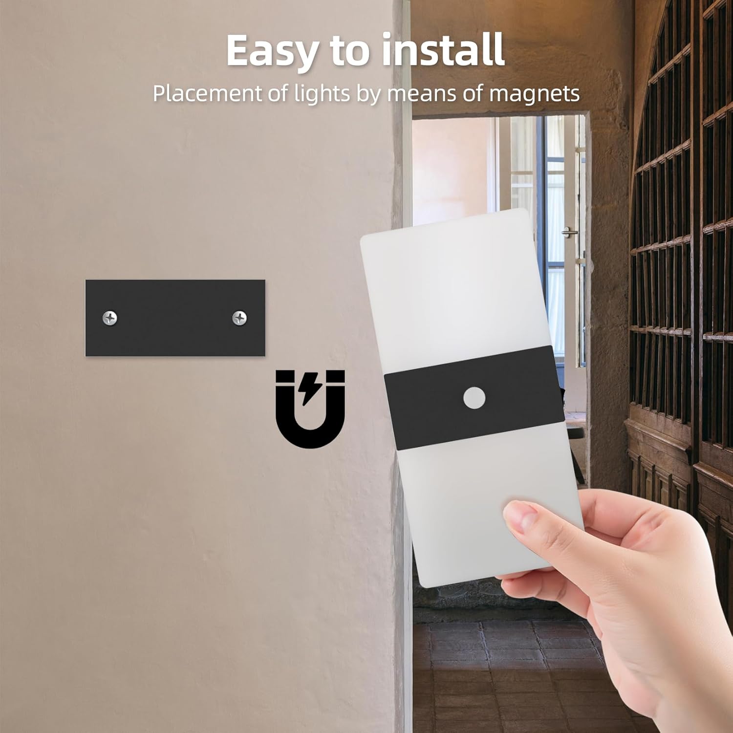 - š”ćEasy Installationć1.Use the included screws to secure the iron piece of the base to the wall.2.Magnetic adsorption, the battery wall light lamp body can be easily adsorbed to the base by the built-in magnet, so it can be effortlessly mounted on any iron surface.