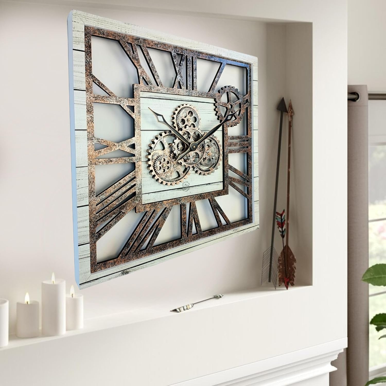 The Gears Clock 24'' Inch Square Real Moving Gear Wall Clock Vintage Industrial Oversized Rustic Farmhouse (White Farmhouse)