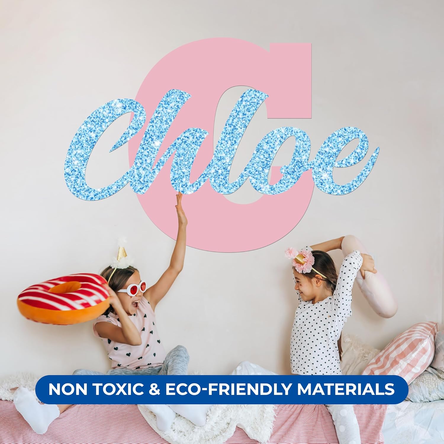 - 🔨 FULLY CUSTOMIZABLE GIRLS NURSERY WALL DECOR: Enhance your child's room decor with a fully customizable name and initial decal! You can also add glitter color for name: stardust, diamond, sparkly aquamarine, navy blue, hyacinth, flirty pink, rose gold glitter, shimmery gold, night sky and holographic. You can choose your child's favorite color for the initial, name, and sizes to create a wall decal that aligns with your decor.