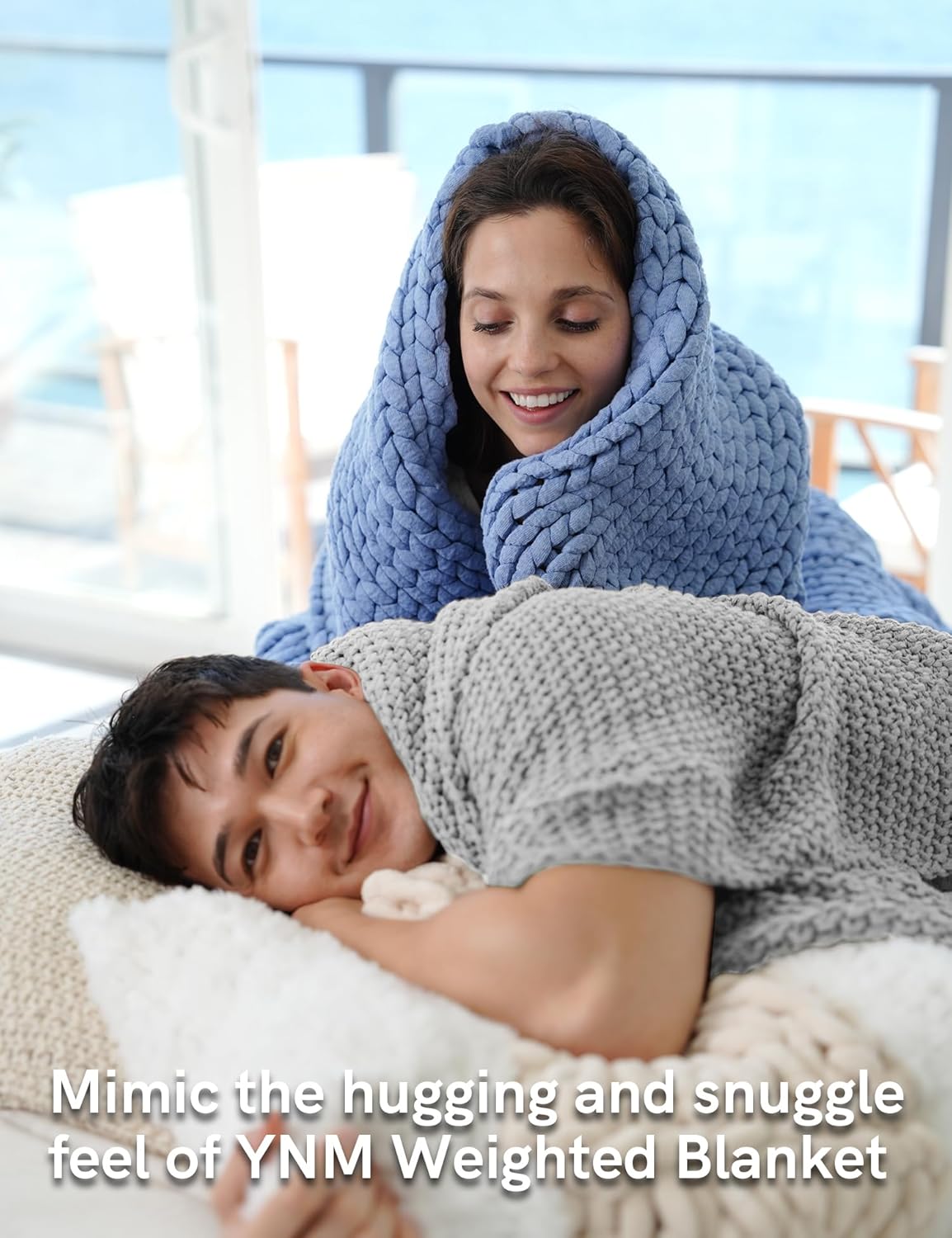 - [Style Meets Function] In order to mimic the hugging and snuggle feel of YNM Weighted Blanket, medium weight chunky yarn is chosen to hand knit this thick blanket(50x60 weighs 4.4lb, 60x80 weighs 7.3lb, 80x87 weighs 10.5lb). This thick chunky yarn not only provide soothing and relaxation feel, but also add texture to your blanket. Wrap around you on the sofa, layer the chunky knit blanket under your duvet or quilt to add warmth, or drape across your bed as a textural throw.