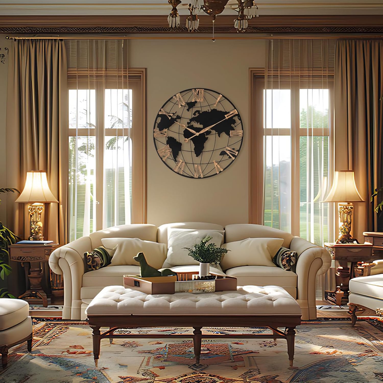 - 【Focal Point of Living Room】 Pytha Sight 30 inch world maps wall clock is a stunning piece,sure to captivate your guests:It fits perfectly above fireplaces,and the vintage gold roman numerals with classical vintage pointers help you read the numbers more:Our beautiful large wall clocks complements your living room decor,adding an elegant touch to your home;With its impressive large wall clock 30 inches or larger,this giant oversized wall clock is a perfect size for any room, and it has become a conversation starter whenever guests visit.