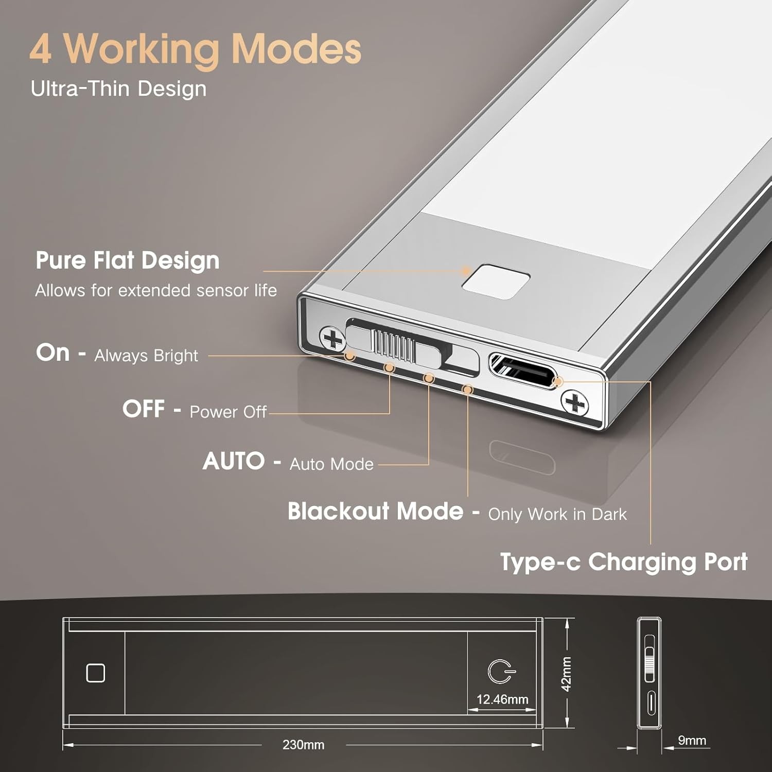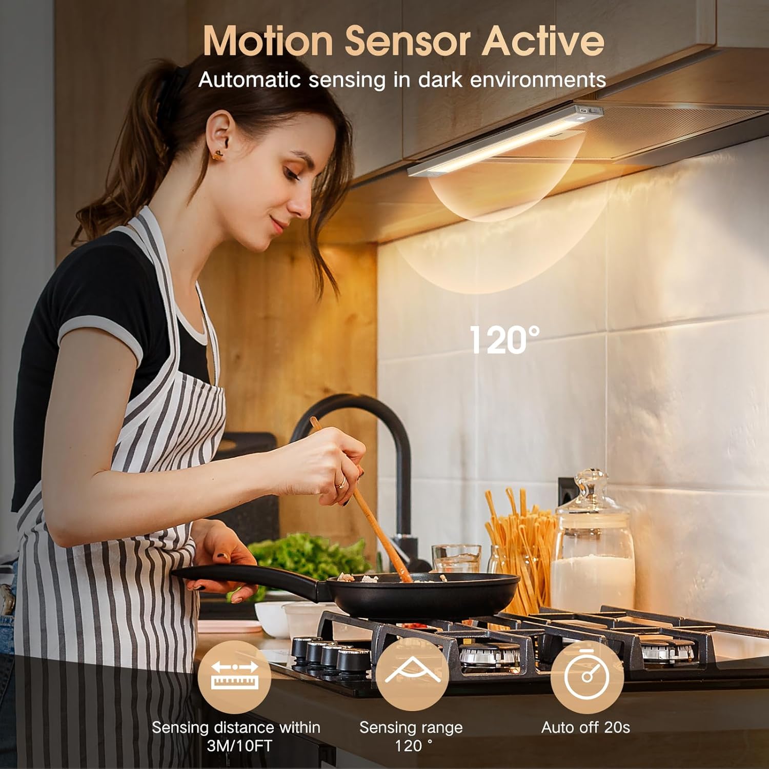- [New Motion Sensor & long-Lasting Use]: The latest flat sensor design extends the life of the motion sensor light, it can sense and light up within 10ft and 120° of the lamp. With 1800mAh rechargeable battery inside, after fully charging, this kitchen cabinet lights last up to 3-5 hours under ON mode and almost 1 month under NIGHT mode. No more Extra AA/AAA Battery. Energy Save & Save More Money!