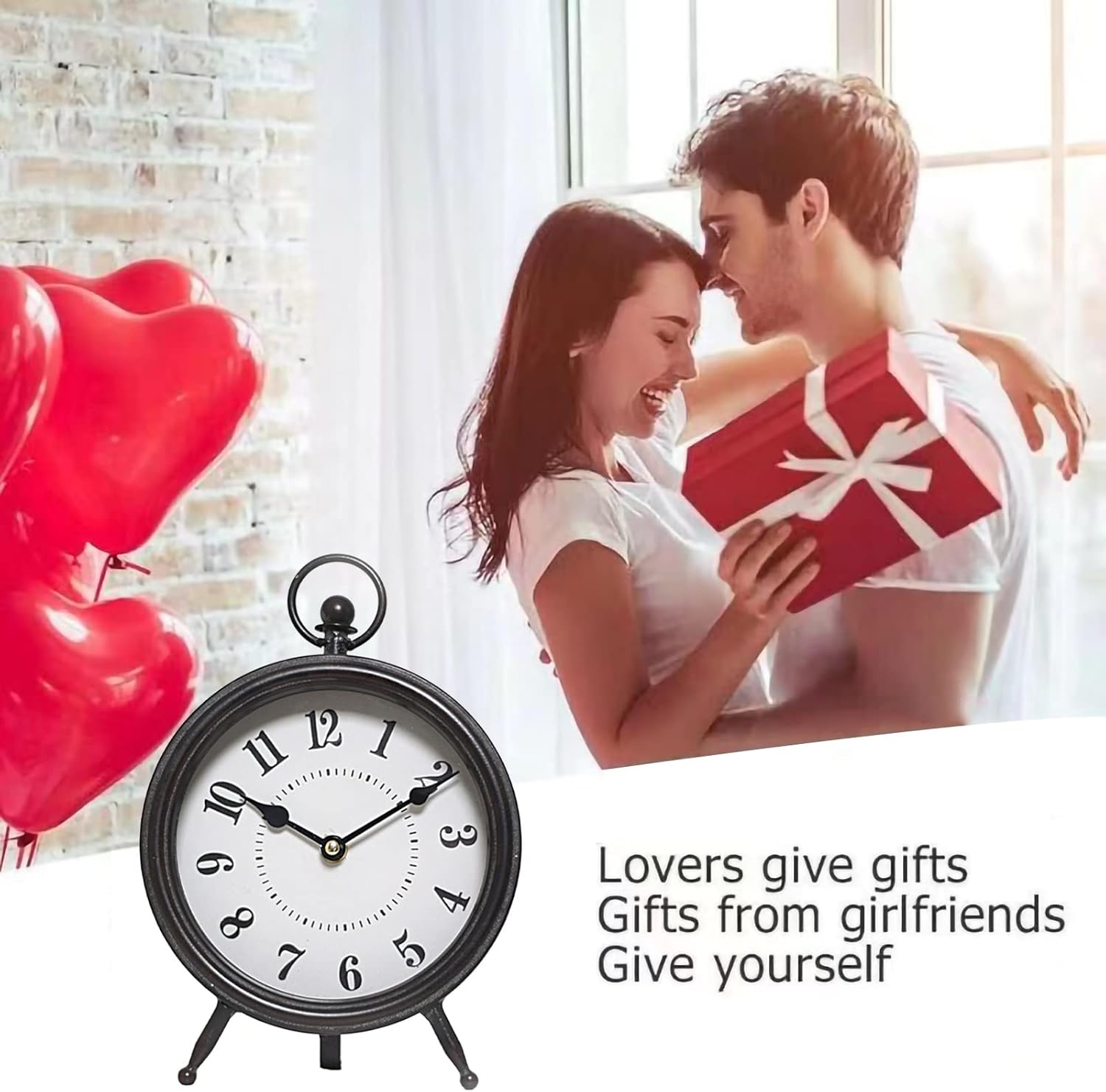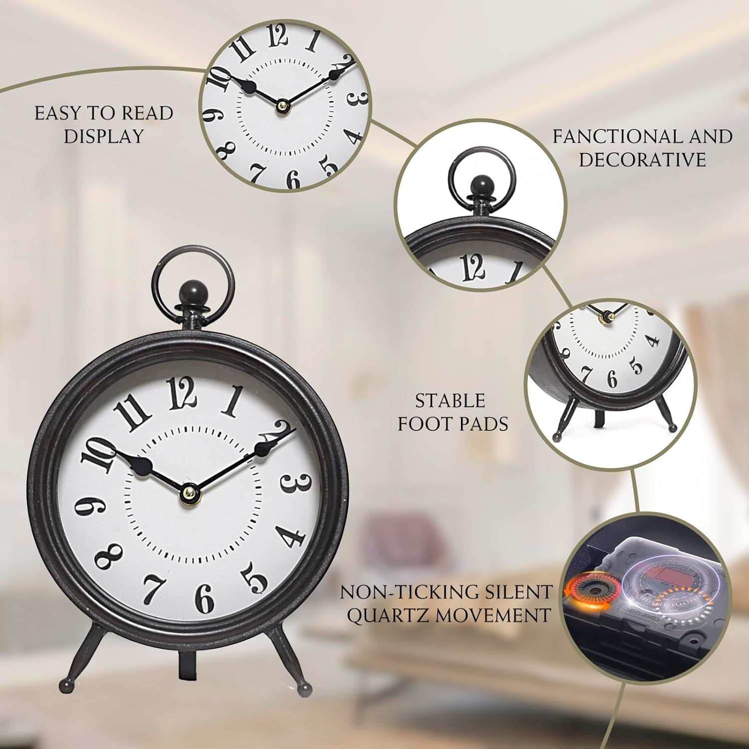 Vintage Decorative Desk and Shelf Clock, Rustic Mantel Clock Farmhouse Clock,Black Table Clock on Stand, Silent Non-Ticking 10.3 * 7.3 inch
