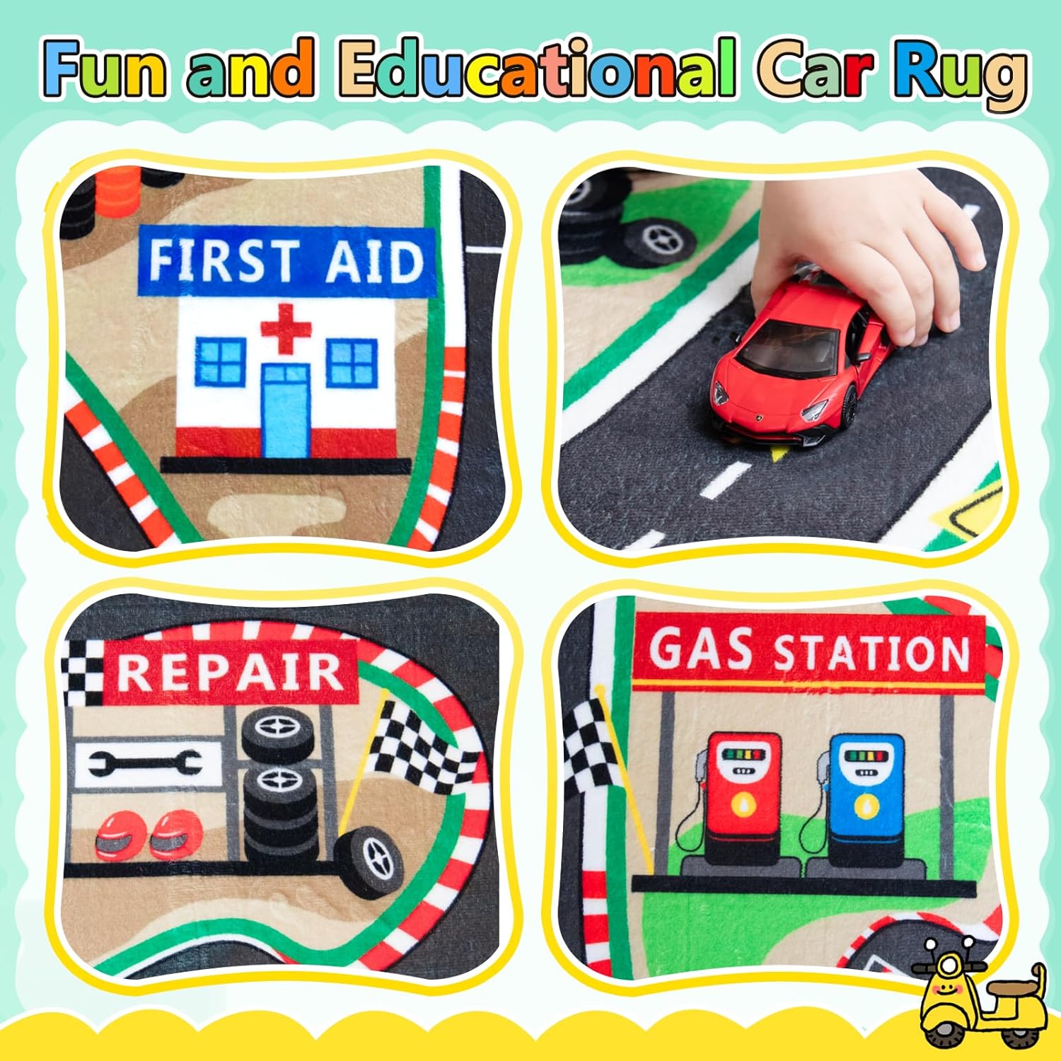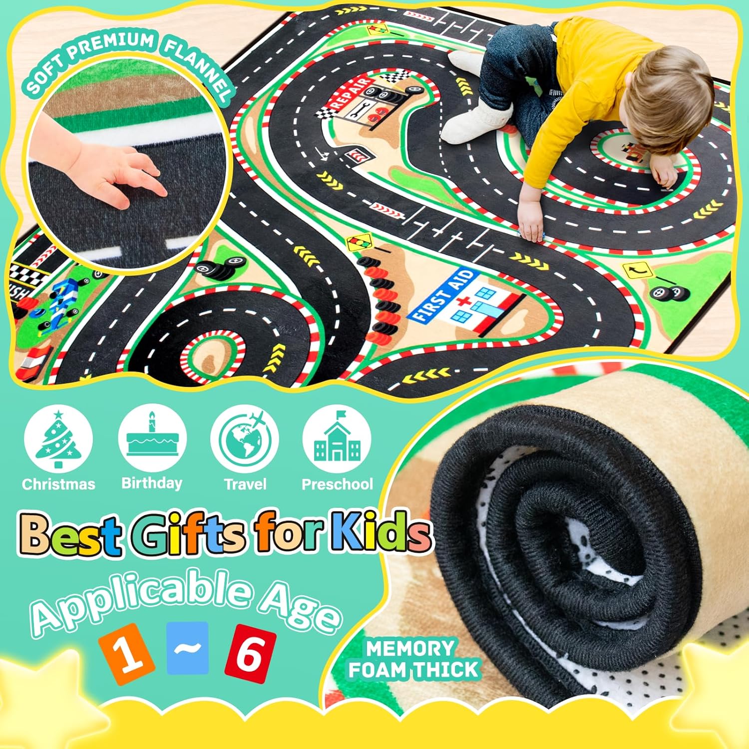 - [Upgraded Material]: Our kids playmat rug is made of premium flannel, and high-resilience sponge, equipped with non-slip backing. The road rug for kids is designed to provide extra cushioning and comfort, protecting babies from bumps and knocks while crawling.
