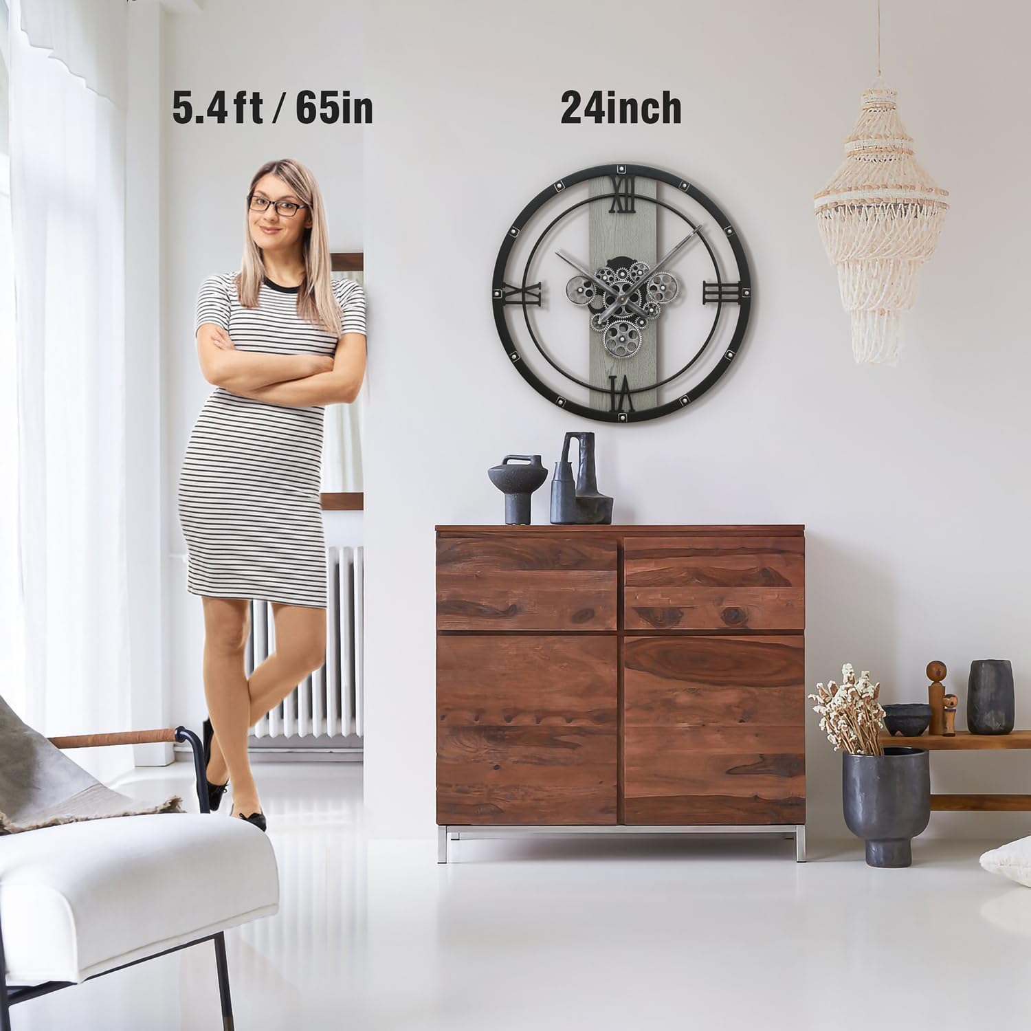 - 【Stunning Living Room Centerpiece】Command attention with this large moving gear wall clock, measuring an impressive 24 inches. Features with real moving gear and roman numerals, it ensures clarity while serving as a stunning centerpiece above mantels or in others places. Ideal for those who appreciate both style and functional decor.
