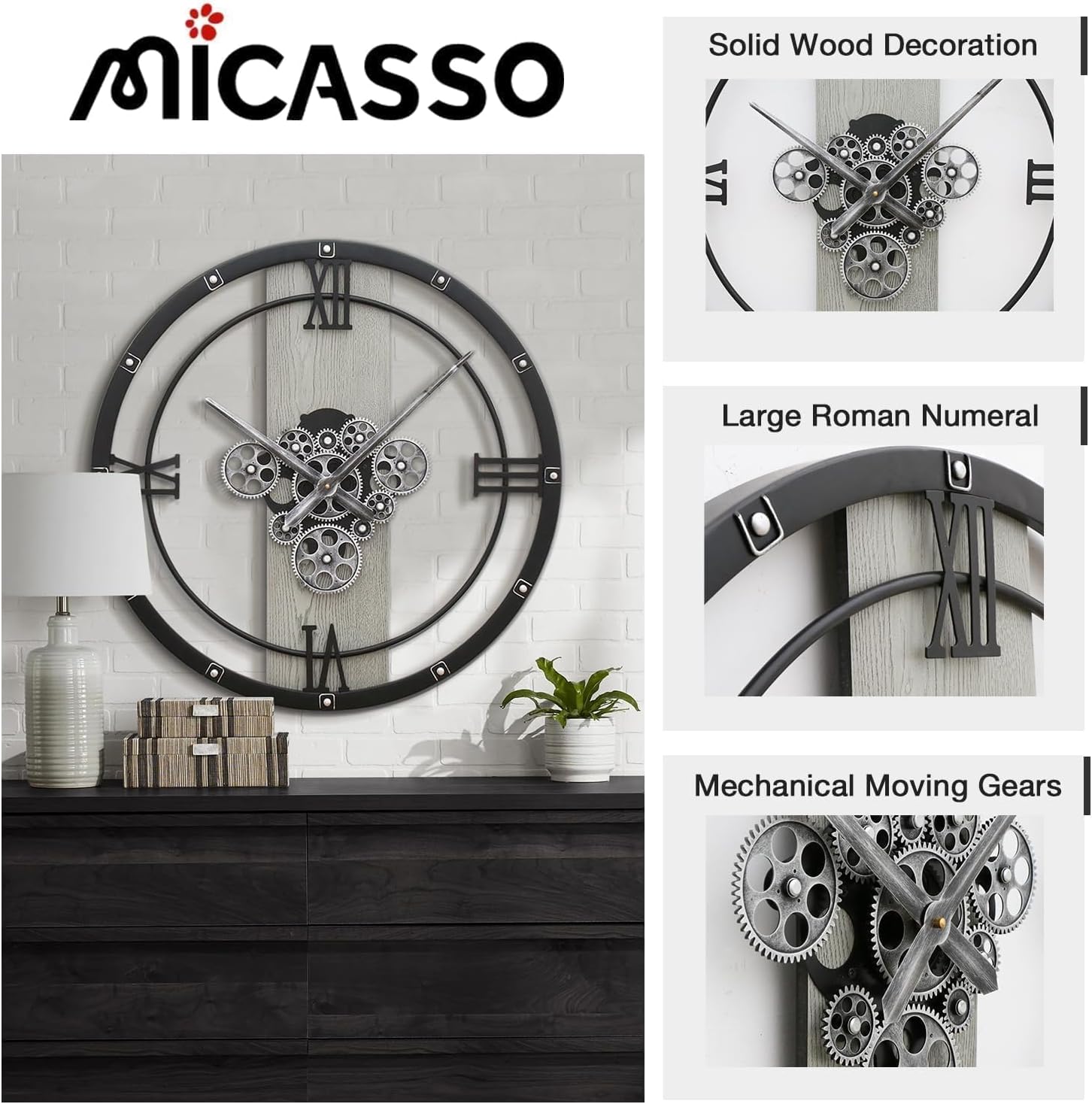 Micasso 24 inch Large Real Moving Gears Wall Clock: Black Industrial Steampunk Roman Numeral Clock - Modern Wall Decor for Living Room/Entryway/Office
