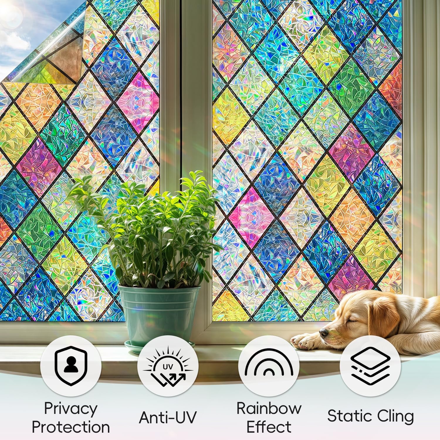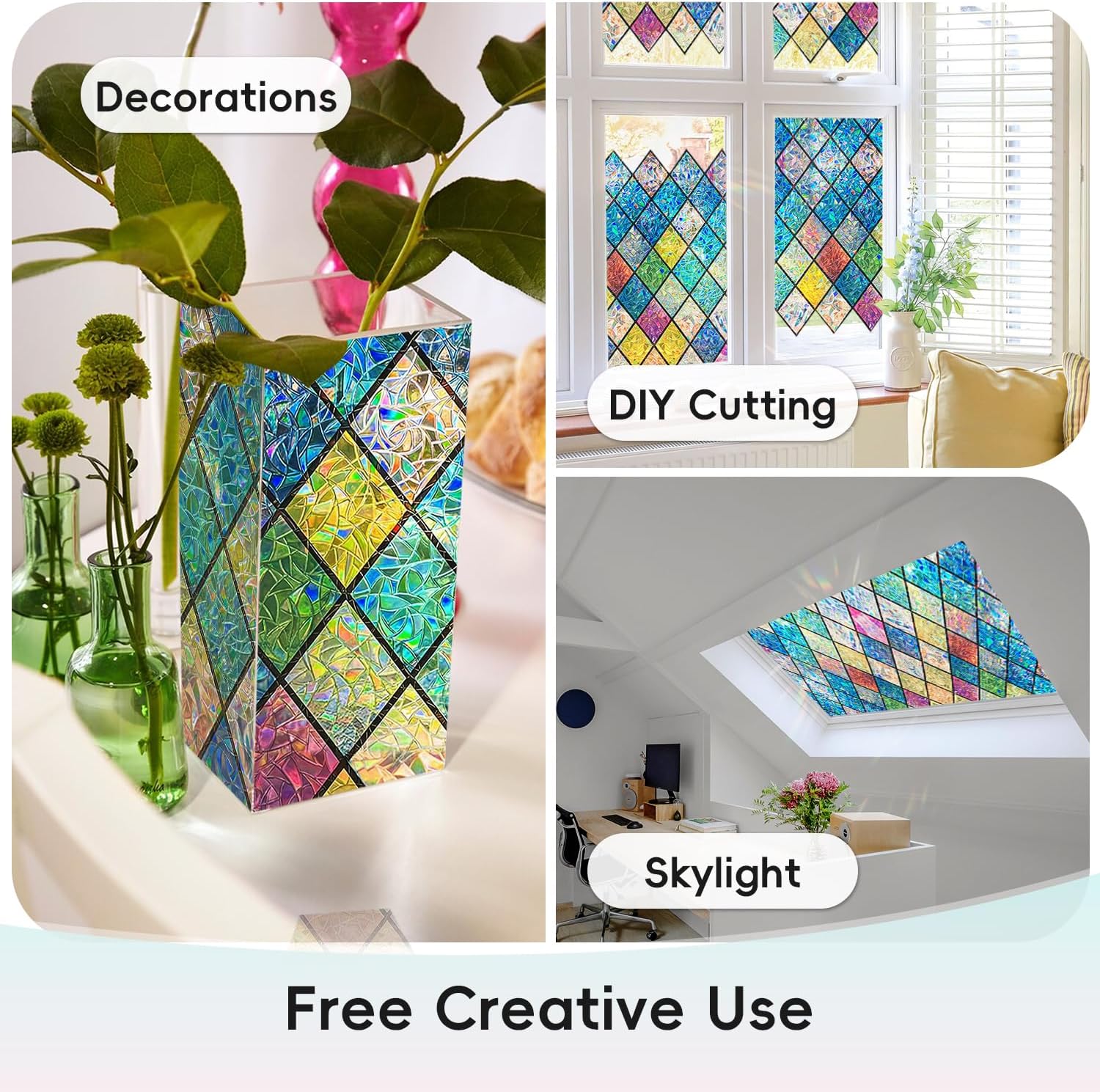 - Enchanting Visual Effect: When sunlight passes through this stained glass window film, it creates a stunning rainbow effect, adding a unique decorative touch to your windows. The colorful diamond pattern reveals vibrant colors under sunlight, creating a beautiful visual effect that elevates the beauty and style of your space
