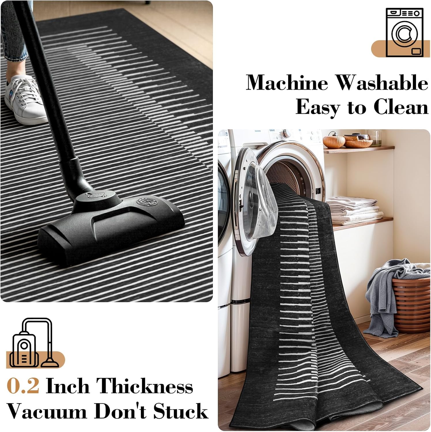Wonnitar Washable Striped Black Runner Rug for Hallway 2'6"x8', Non-Slip Kitchen Runner Rug, Low Pile Minimalist Soft Rug Runner for Bedroom Hallway Bathroom Laundry Entryway (Black, 2'6" x 8')