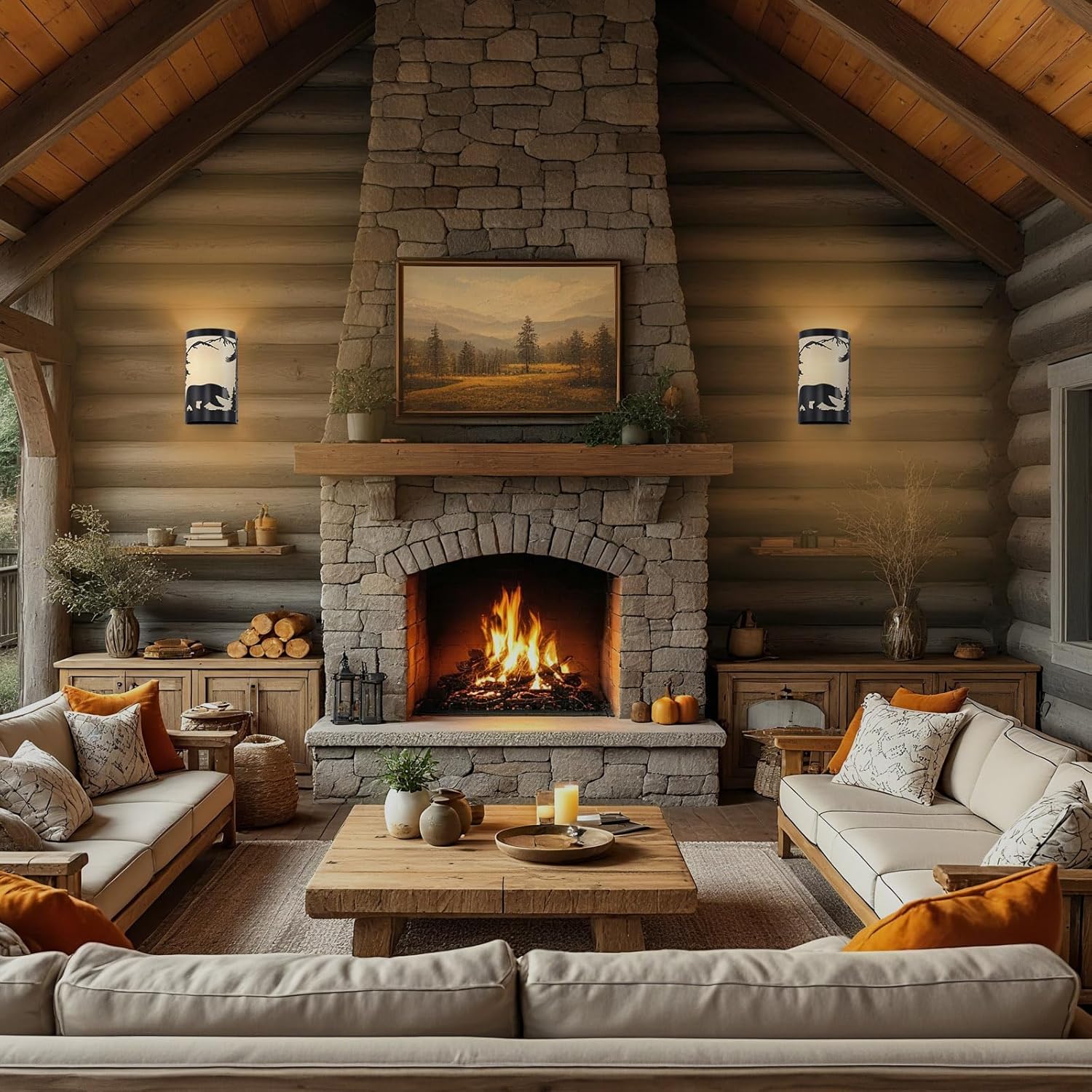 - Rustic Design: Black wall sconces set of two is crafted from durable matte black metal,featuring intricate forest elements and a bear silhouette,white parchment paper adds a soft,warm glow,enhancing industrial aesthetic of the vintage wall sconce