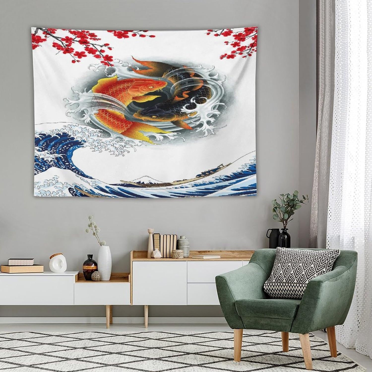 Houselerax Koi Fish Tapestry, Japanese Style Yin Yang Big Wave Cherry Blossoms Tapestries Wall Hanging for Bedroom Living Room Office Decor 80"x60"