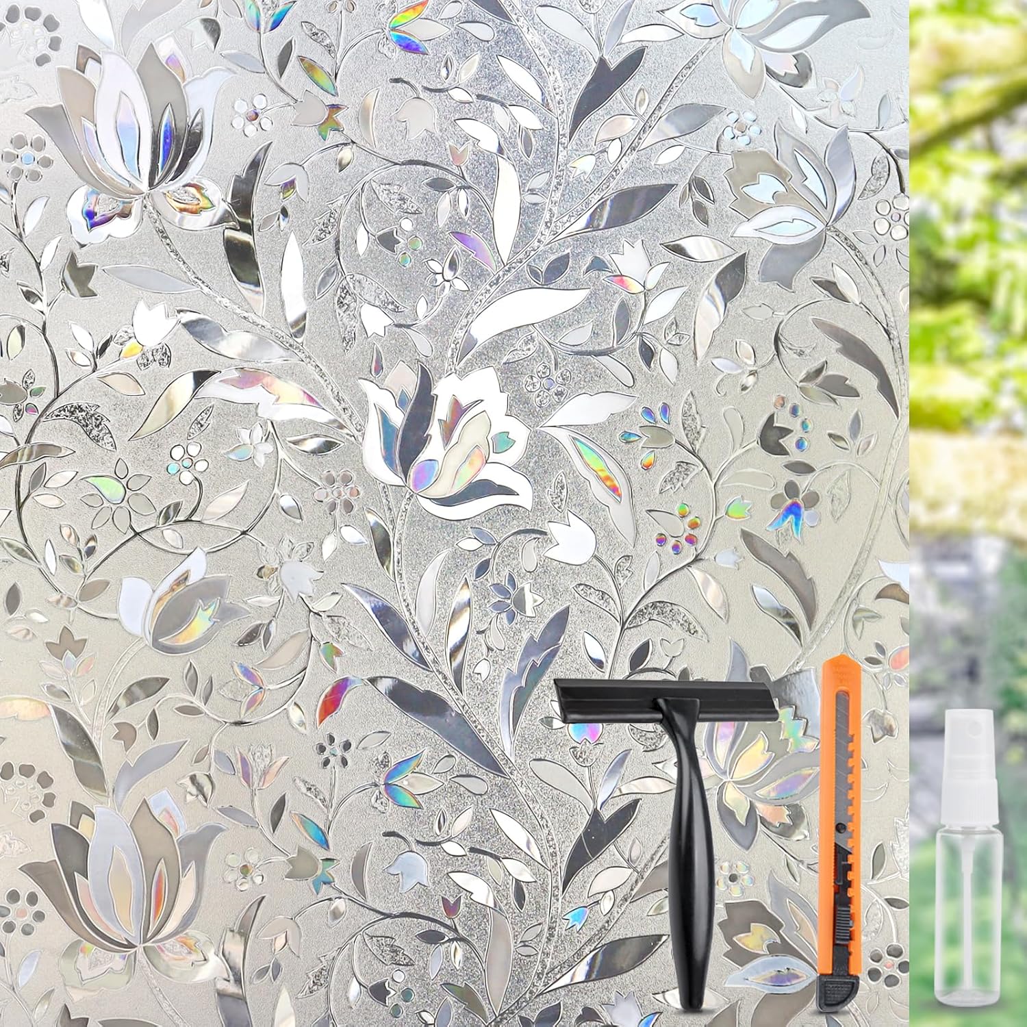 HIDBEA Window Privacy Film, 3D Stained Glass Static Cling - Sun Blocking Anti-UV Heat Control, Reusable Decorative Film for Home/Office Doors, Rainbow Tulip Design (23.6 in x 78.7 in)
