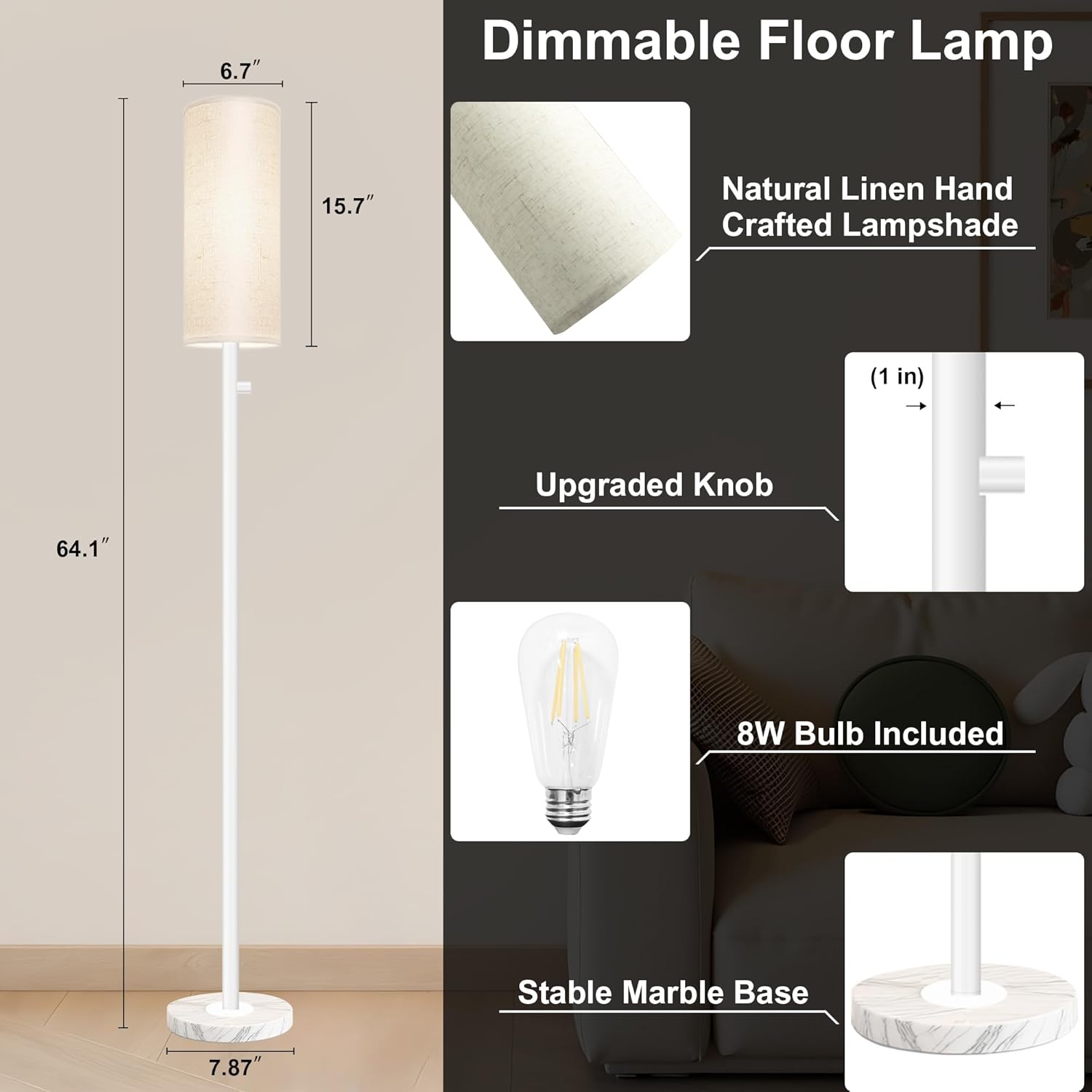 Floor Lamp for Living Room,Dimmable Floor Lamp with LED Bulb,Modern Standing Lamp with Marble Base,Tall Standing Lamps for Living Room,Bedroom,Office,Reading and Nursery(White)