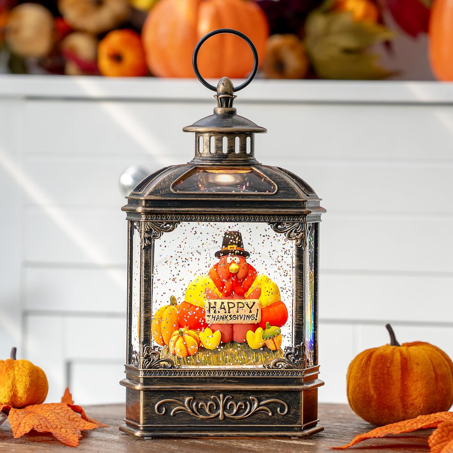 10.5'' Fall Snow Globe Lantern - Thanksgiving Glittering Lighted Water Lantern, Fall Decorations Autumn Harvest Day Gifts, Home Fall Halloween Decor (Turkey & Pumpkins)