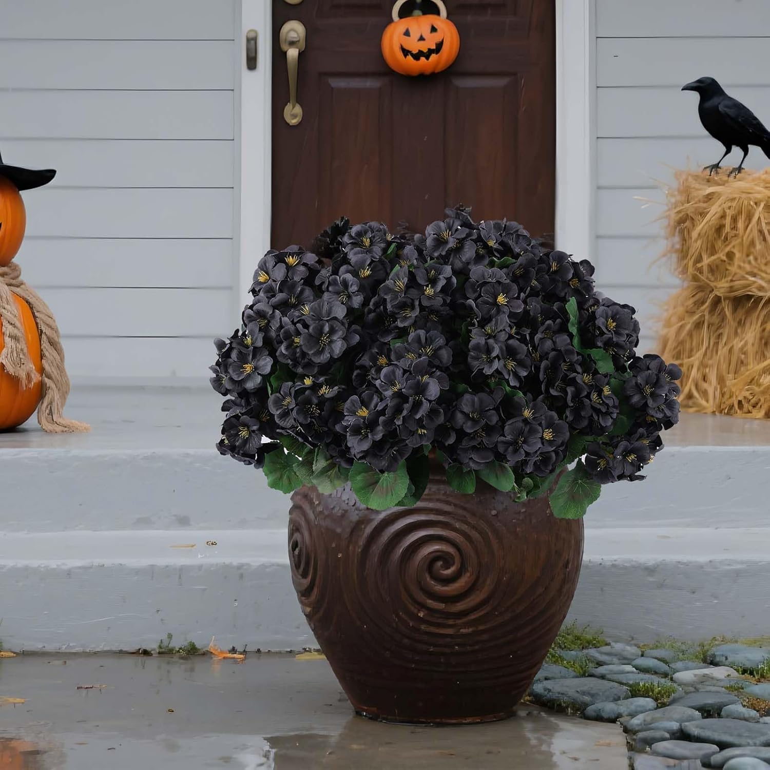 Hananona 12 Bundles Artificial Geranium Flowers for Outdoors Black Silk Geranium Flowers Outdoor UV Resistant Plants Faux Black Flower for Home Kitchen Halloween Table Centerpieces Decor (12, Black)