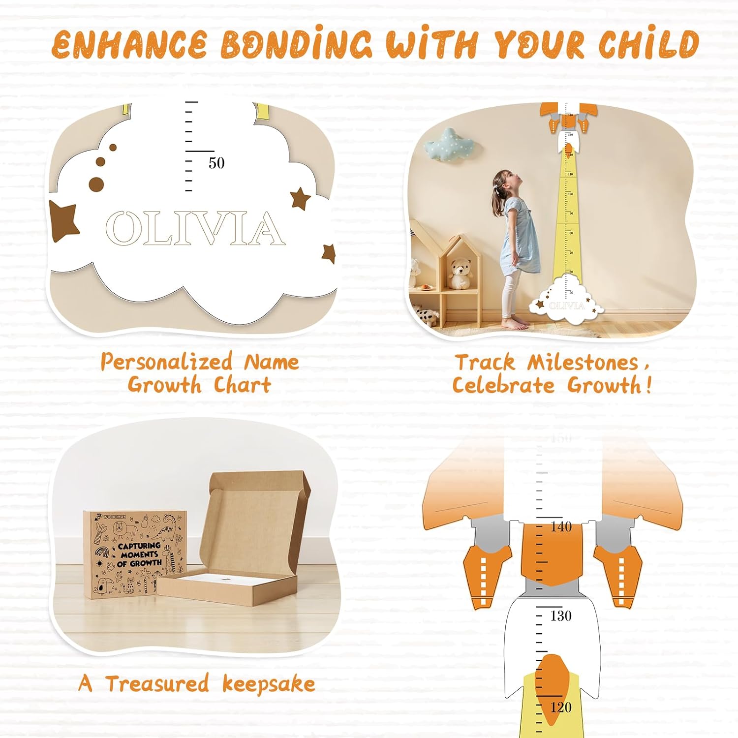 Personalized Name Height Chart for Kids, Cute Rocket Wooden Growth Chart for Kids, Wall Height Chart for Children, Cute Wall Ruler for Kids, Track Height Measurement, Easy to Install
